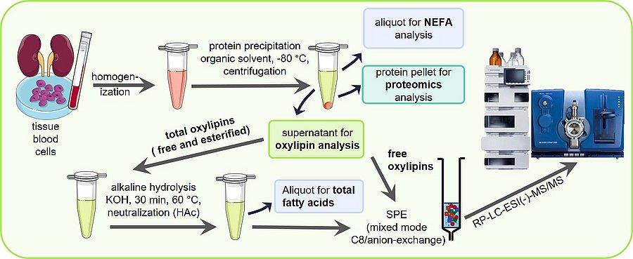 Sample preparation is key for a sound oxylipin analysis. A comparison of different solid phase extraction methods as well as liquid liquid extraction can be found in Ostermann et al., 2015. The optimization of the release of esterified oxylipins by saponification to make them accessible for LC-MS analysis is described in Ostermann et al., 2020. Based on this a standard operation procedure SOP for the analysis of total oxylipins has been published in Koch et al., 2020, excel SI. A more detailed version can be also found in Mainka et al., 2020, excel SI and Rund and Schebb, 2023. An SOP for the analysis of free oxylipins can be found in the article of Kutzner et al., 2019 and again more detailed in Rund and Schebb, 2023.